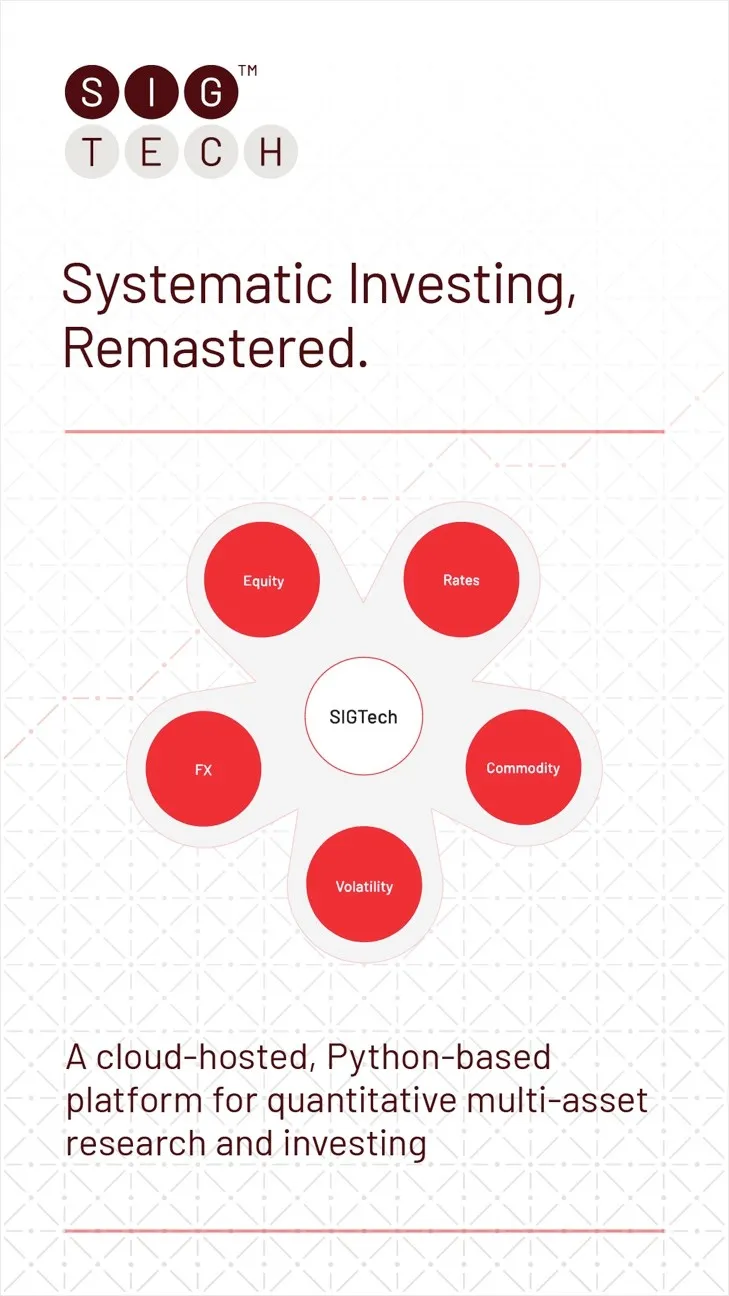 SIGTech is a fintech, offering a cloud-hosted platform for financial and academic institutions to conduct quantitative multi-asset research and investment. Our python-based, SaaS platform is ready to go with cleaned, pre-validated data in equities, rates, FX, commodities and volatility, lowering the barrier to entry for systematic research, backtesting and investment.